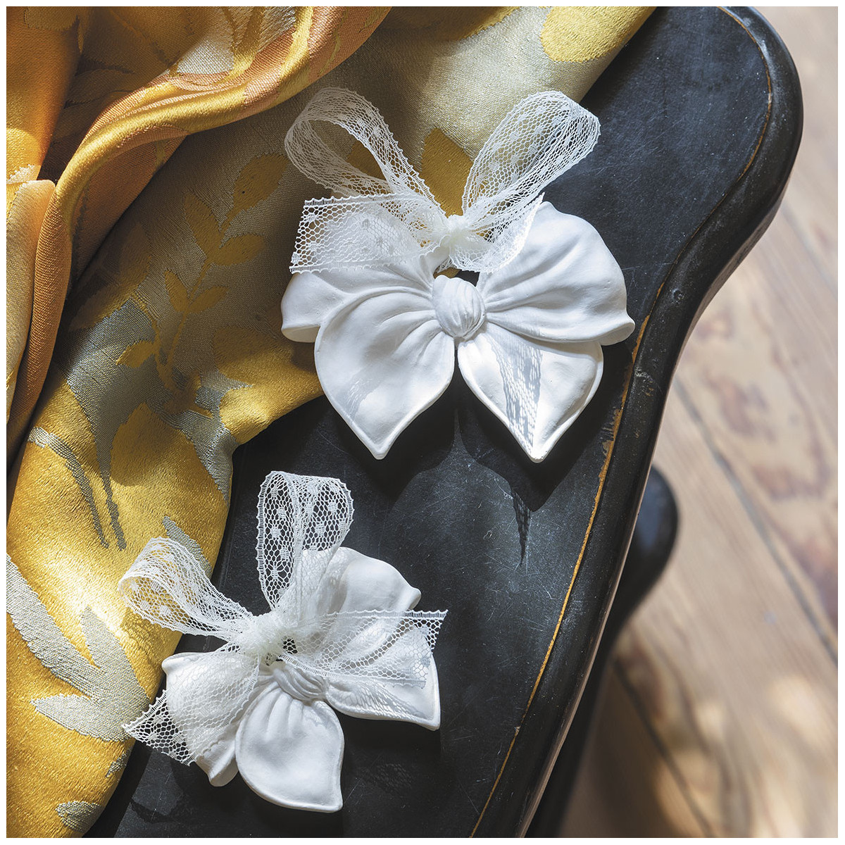 Este lazo decorativo perfumado es una pieza delicada y elegante, pensada para quienes cuidan cada detalle de su hogar. Confeccionado en tejido satinado blanco, se completa con un fino encaje translúcido que le aporta un aire romántico y atemporal.