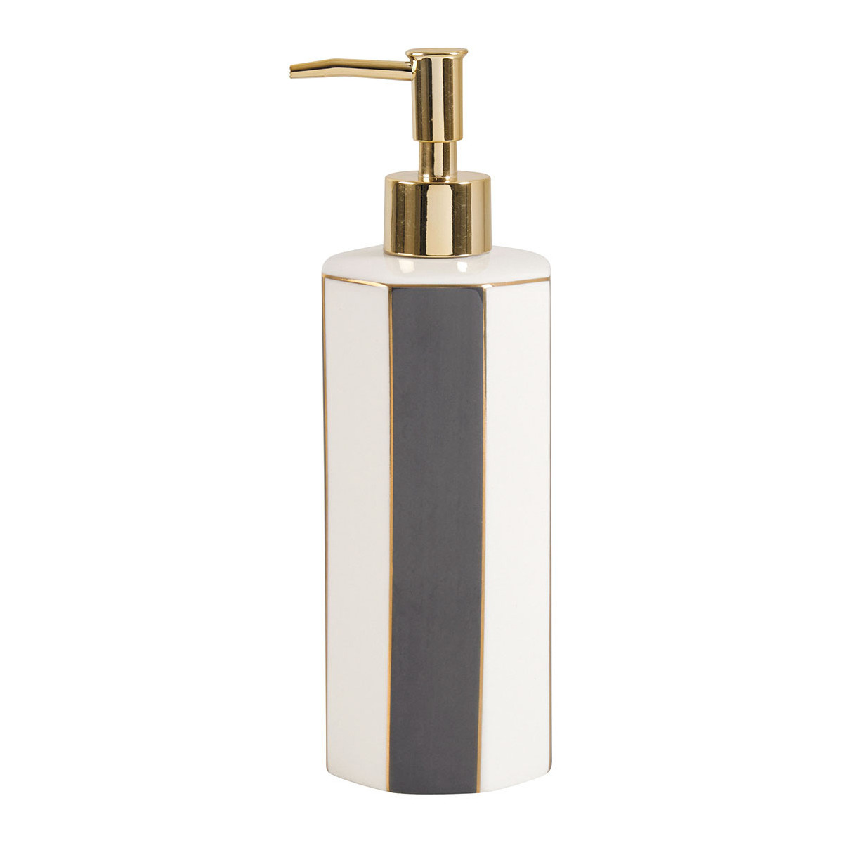 Dispensador de jabón elegante en cerámica blanco y gris con dosificador dorado